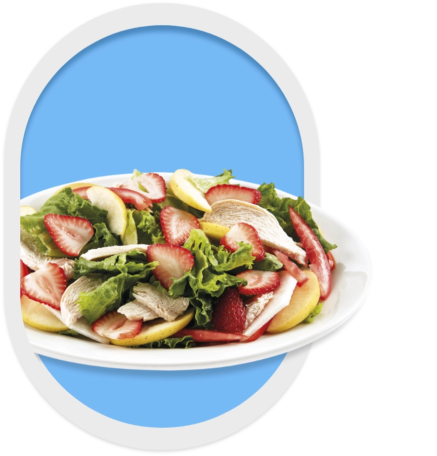 Mezcla de espinaca y lechuga italiana, con cubos de durazno, queso panela, manzana y pechuga asada, espolvoreada de ajonjoli